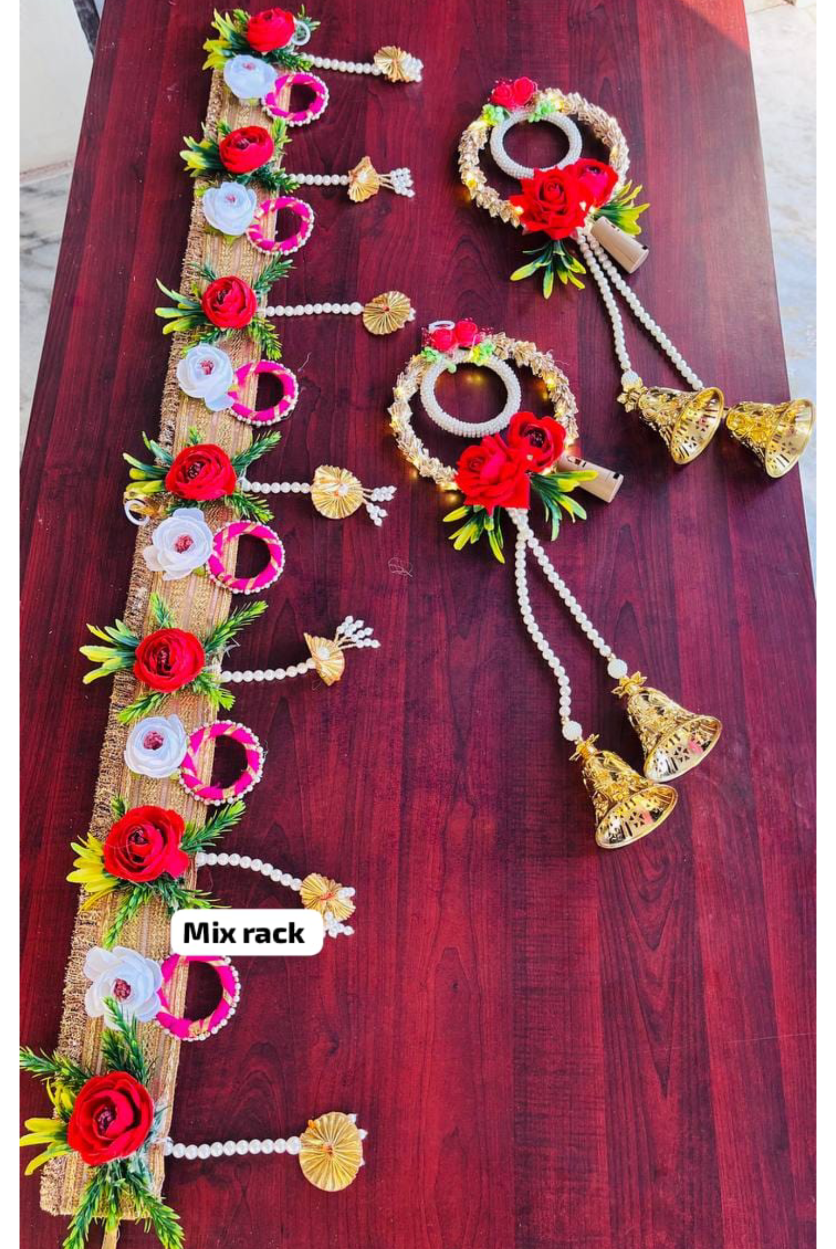 Adorned with artificial blooms and moti beads, this toran is perfect for decorating door fronts, mandir entrances, or as a standout piece for weddings and indoor parties.